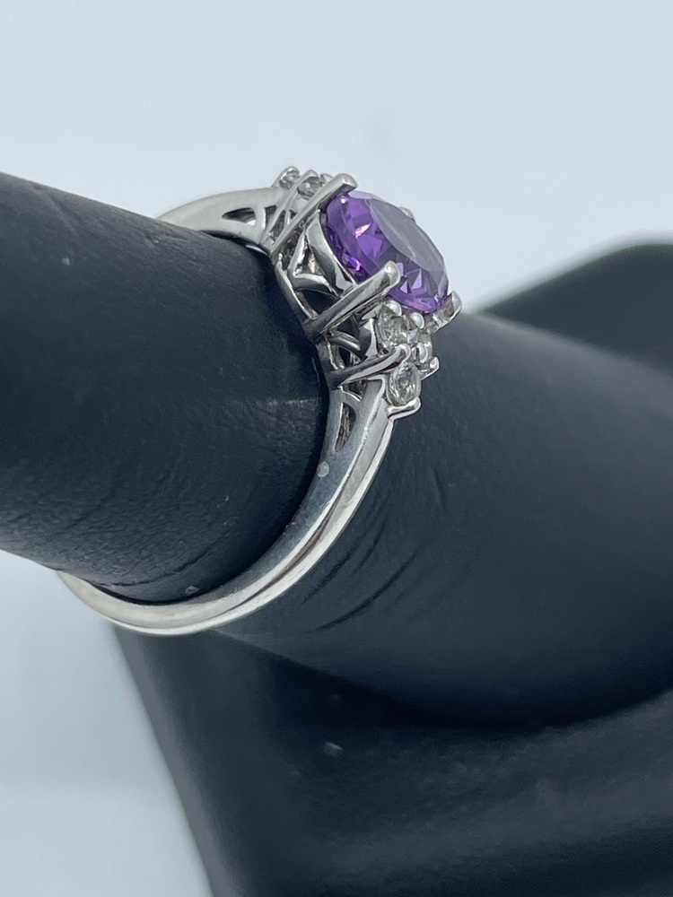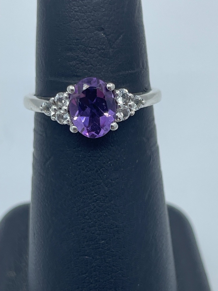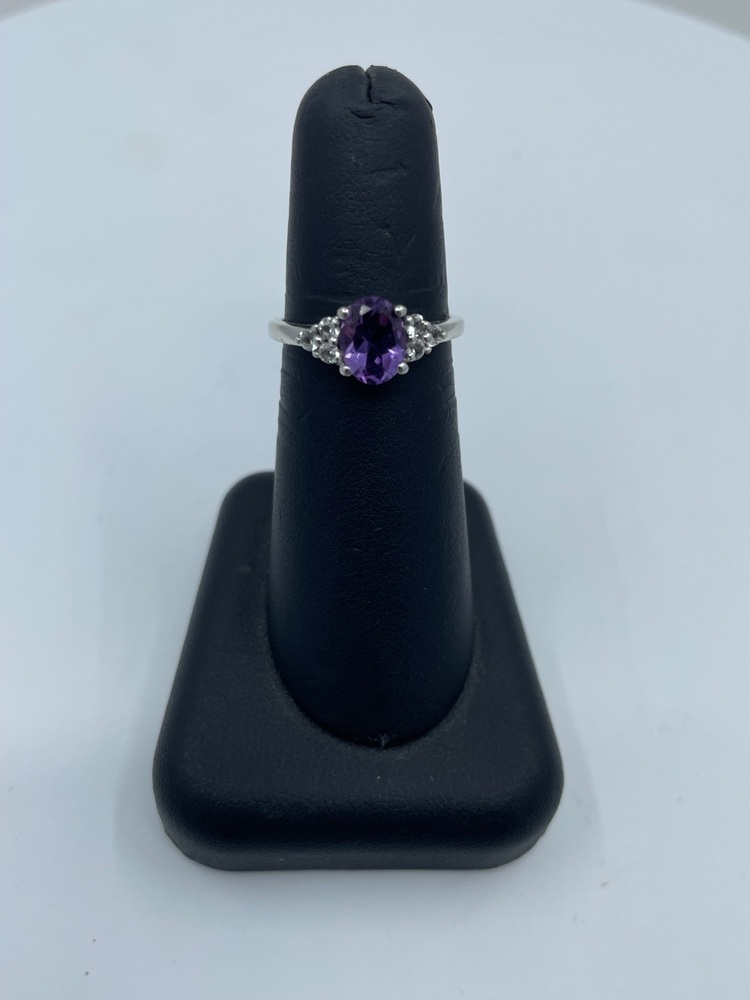 Delve into the realm of subtlety and elegance with this immaculate sterling silver ladies' ring that exudes charm. This refined piece elevates your style quotient to unimaginable heights with its regal oval Amethyst centerstone. The lustrous lavender shade of the stone strikes the perfect balance of luxury and sophistication. Skillfully positioned CZ accents enhance the ring's luxurious aesthetic, adding twinkling gleams to the design. This classic yet stylish piece, nestled comfortably in size 6.5, lends an air of royal essence to your persona, ensuring a sparkling presence at every sweep of your hand. A ring dedicated to the regal woman in you.