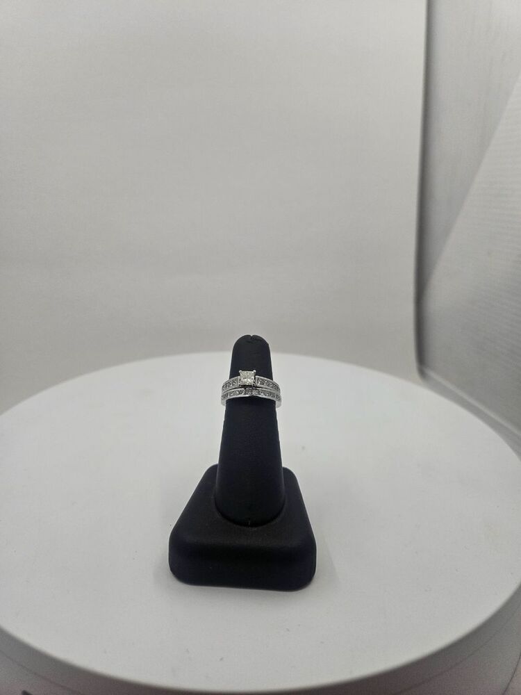 - A princess-cut diamond gleams in a band of smaller channel-set princess-cut diamonds along the engagement ring