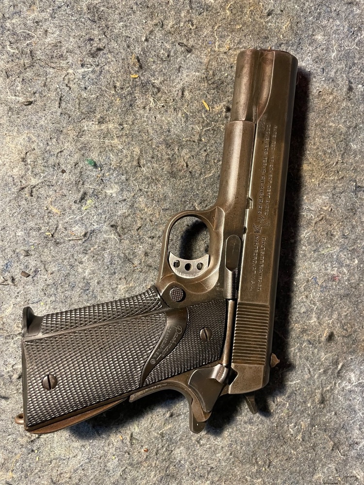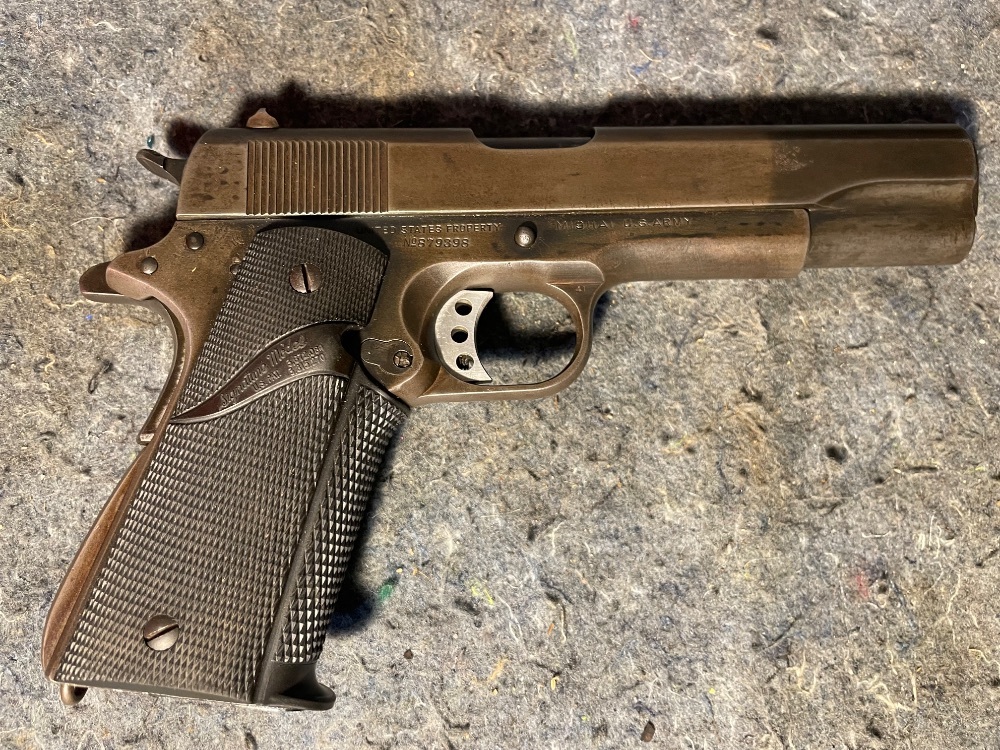 The 1943 WWII Colt M1911A1 Semi Auto is a .45ACP caliber semi-automatic pistol. Renowned for its solid construction and enduring design, it boasts a 7-round magazine and has served as a standard-issue sidearm for US Armed Forces during WWII. Known for its accuracy and reliability, the M1911A1 has a reputation for formidable stopping power. The 1943 version holds historical significance, being produced in the midst of the war, making it a treasured collectable for firearm enthusiasts. Despite its age, this pistol's top-tier effectiveness continues to influence modern firearm designs.