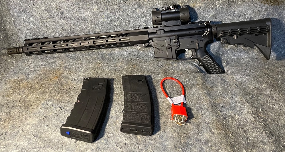 Anderson AM-15 is a series of semi-automatic AR-style rifles based on the M-4 military rifle. It comes standard with M-4 optics-ready upper receiver, polymer A2 butt stock, and free float barrel. This rifle has an anodized low-profile hand guard. Chambered in 5.56 NATO/.223 Remington caliber. The pistol grip is standard A2. The barrel is 18-inches in length. This rifle comes equipped with a UTC Quick Aim Red/Green Dot Scope already mounted, 2 magazines and gun lock.
