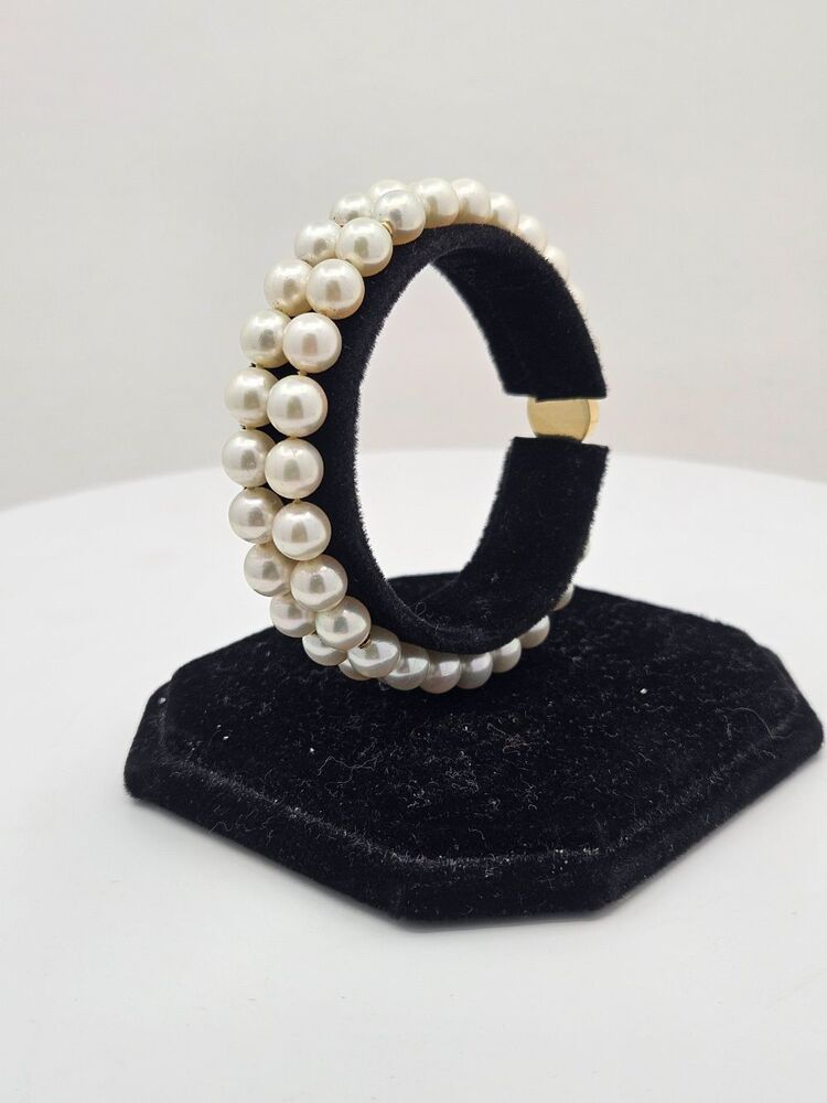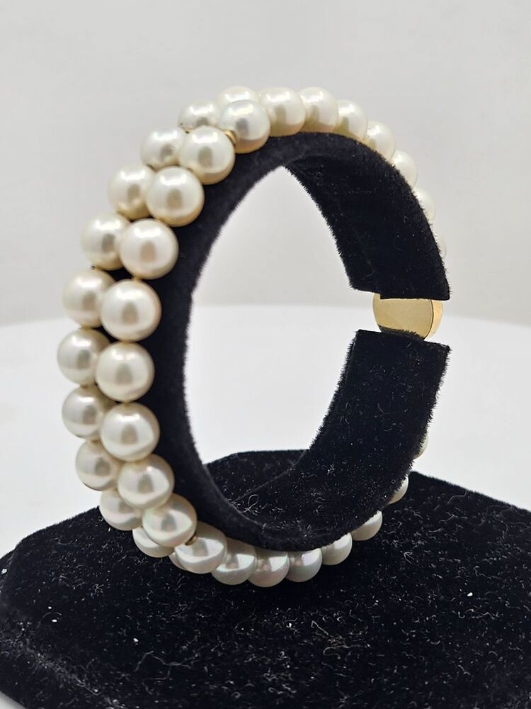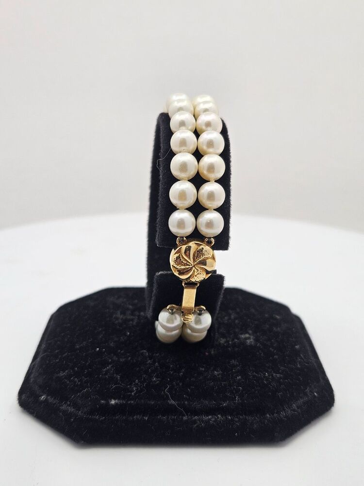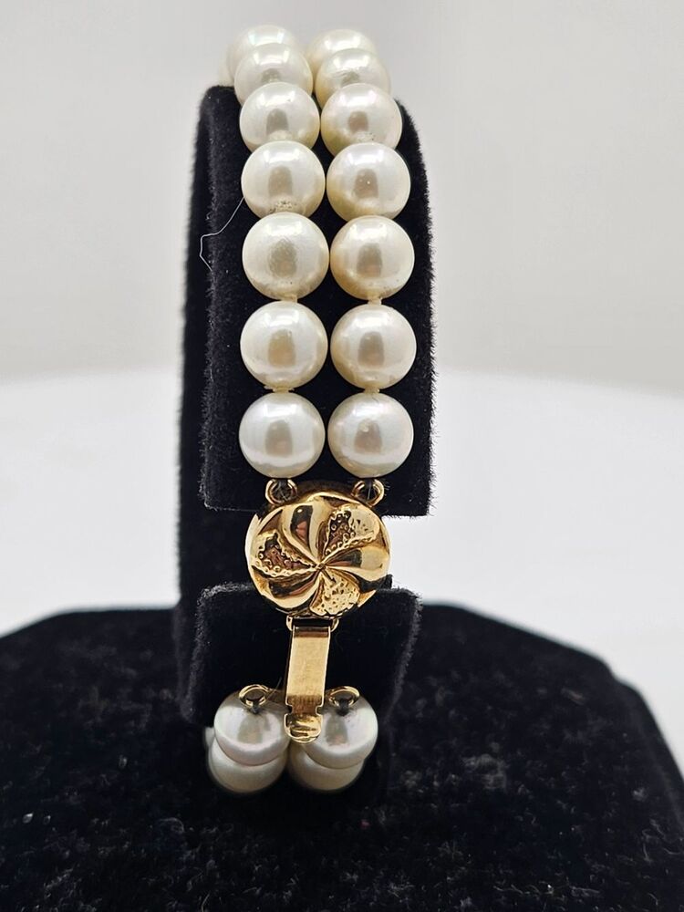 This stunning Double Strand Pearl Bracelet is the epitome of regal sophistication and timeless elegance. Perfect for expressing an unspoken depth of class, it exhibits two rows of perfectly matched, lustrous pearls. Their radiant glow would bewitch any onlooker, inviting admiration and awe. The pearls gracefully encircle the wrist, culminating in a magnificent 14 karat yellow gold clasp. This highlight provides not only a visual contrast but also a stylish touch of luxury. The clasp design lends a sleek, modern edge to an otherwise classic piece, skillfully marrying old charm and contemporary aesthetics. For added security, the bracelet includes a figure 8 safety lock to ensure it remains safely adorning your wrist throughout the day. Lounge in comfort or grace the most elegant affairs without worrying about its safety.