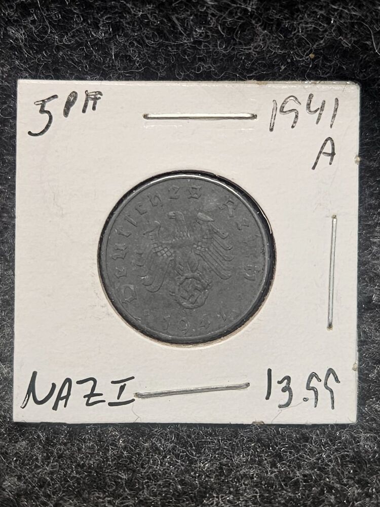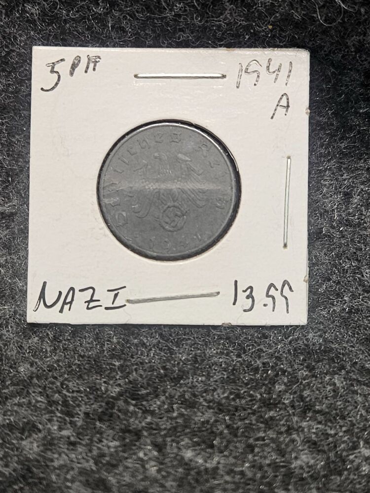 A "941 A Nazi 5 Reichspfennig" refers to a German zinc coin from 1941 (marked '941') with mintmark 'A' (Berlin), featuring the Nazi eagle, swastika, oak leaves, and the denomination '5 Reichspfennig', a small value currency used by the Third Reich, typically made of zinc and about 18mm wide, part of WWII-era emergency issues.