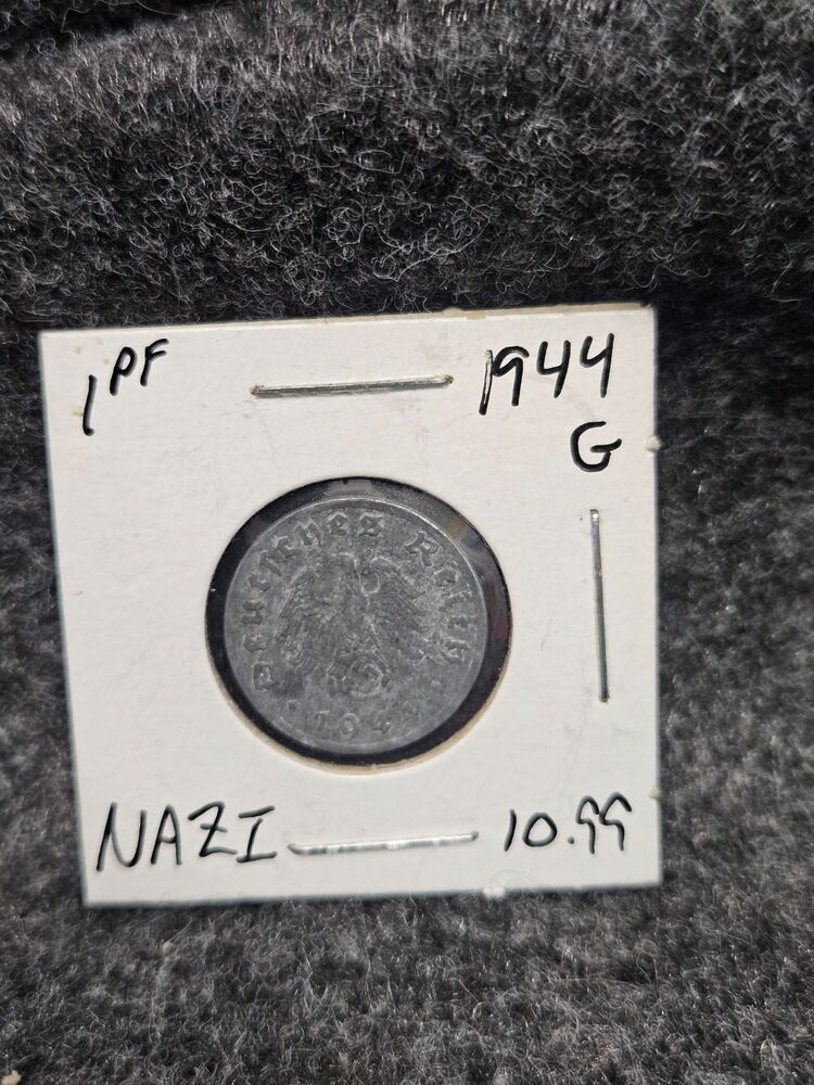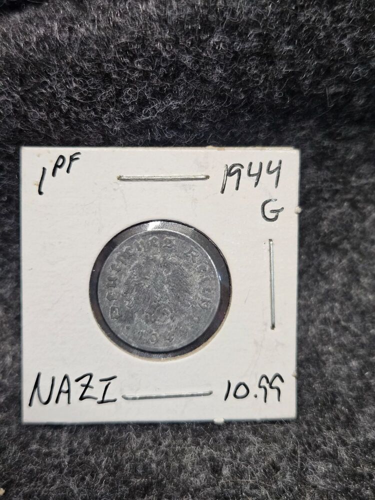 The 1944 G Nazi Reichspfennig is a historical WWII-era coin made of zinc, minted in Karlsruhe, Germany. It is generally inexpensive in circulated condition, with value typically ranging from a few cents to a few dollars, though specific condition and denomination can affect this.