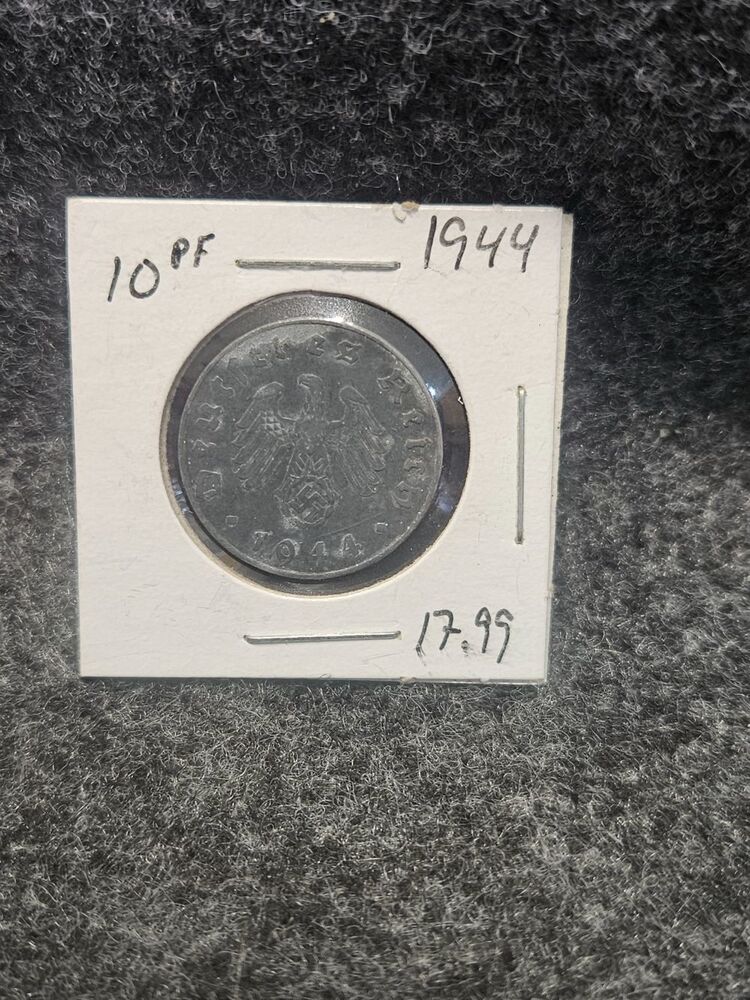 The 1944 10 Reichspfennig coin is a historical currency from Nazi Germany, made of zinc as a wartime cost-saving measure. These coins are widely available to collectors and generally hold a value of a few US dollars, though condition and specific mint marks can affect the price.