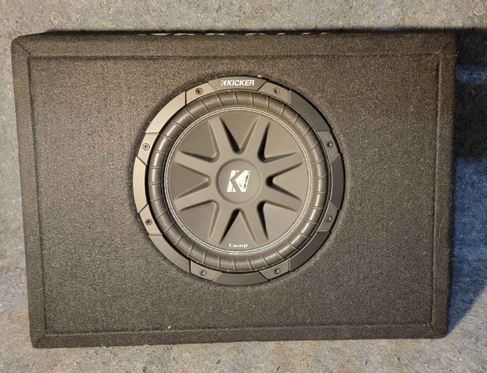 Convenience and raw power in a single little package of audio perfection, the new Kicker 43TC104 Single 10-Inch Comp 150W Loaded Subwoofer Enclosure will turn your car audio awesome-ness up to 10.This loaded box features a 10-inch subwoofer with a single 4-ohm terminal, 600 watts of peak power, and 300 watts of RMS power. The thin profile takes up less space in your vehicle, and the whole enclosure measures 21.75 x 7.69 (bottom) x 4.75 (top) x 15 inches.Kick your car audio up a notch with the Kicker 43TC104 Single 10-Inch Comp 150W Loaded Subwoofer Enclosure.