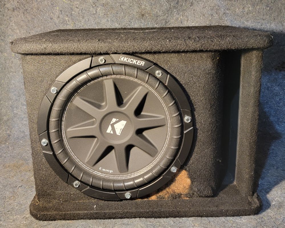 Convenience and raw power in a single little package of audio perfection, the new Kicker 43TC104 Single 10-Inch Comp 150W Loaded Subwoofer Enclosure will turn your car audio awesome-ness up to 10.This loaded box features a 10-inch subwoofer with a single 4-ohm terminal, 600 watts of peak power, and 300 watts of RMS power. The thin profile takes up less space in your vehicle, and the whole enclosure measures 21.75 x 7.69 (bottom) x 4.75 (top) x 15 inches.Kick your car audio up a notch with the Kicker 43TC104 Single 10-Inch Comp 150W Loaded Subwoofer Enclosure.