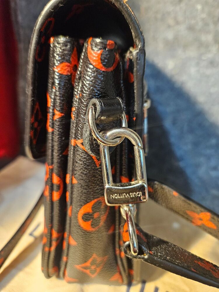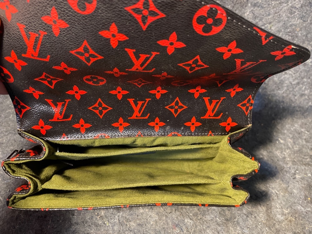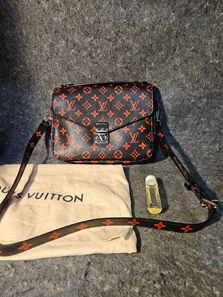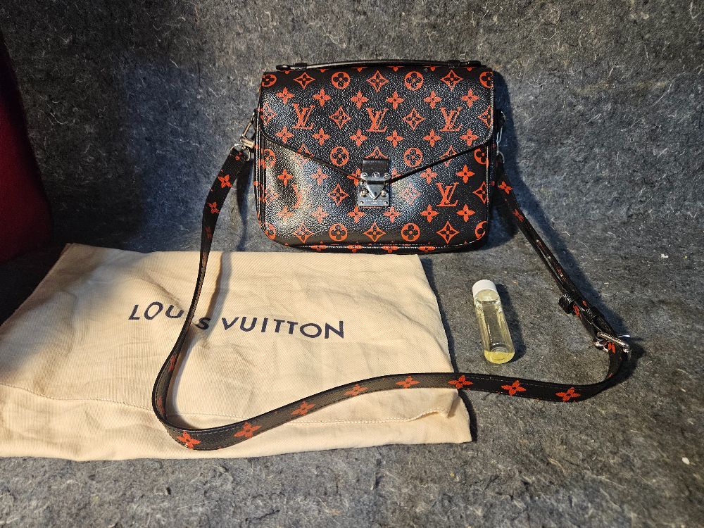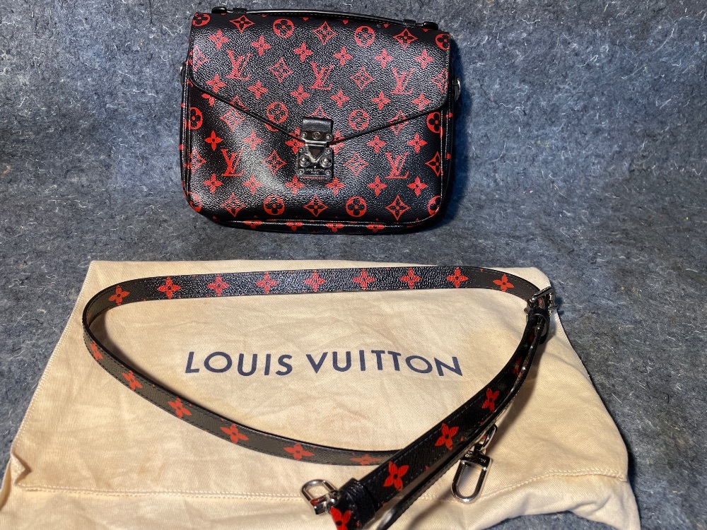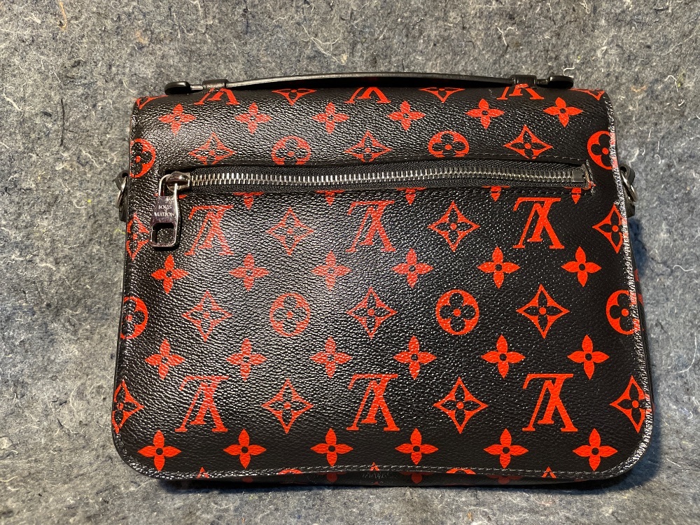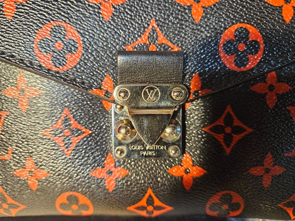 From the 2016 Spring/Summer collection the Infrarouge collection is an edgy update from Louis Vuitton Creative Director, Nicolas Ghesquiere. This stunning line features shiny black coated canvas with gorgeous deep red monogram print on top. A modern day reinterpretation of the classic Monceau briefcase, the Metis is a newer creation. Named after the Greek Titans, Ocean and Tethys, Metis was the first great spouse of Zeus. The Greek word Metis means a combination of wisdom and cunning which perfectly portrays this beautiful bag. A simple vachetta top handle and an adjustable Monogram canvas shoulder strap that is perfect for hands-free convenience. This adorable Pochette Metis features an exterior zip pocket, the iconic LV S-lock, and a spacious interior with several compartments. Perfect for every day use!