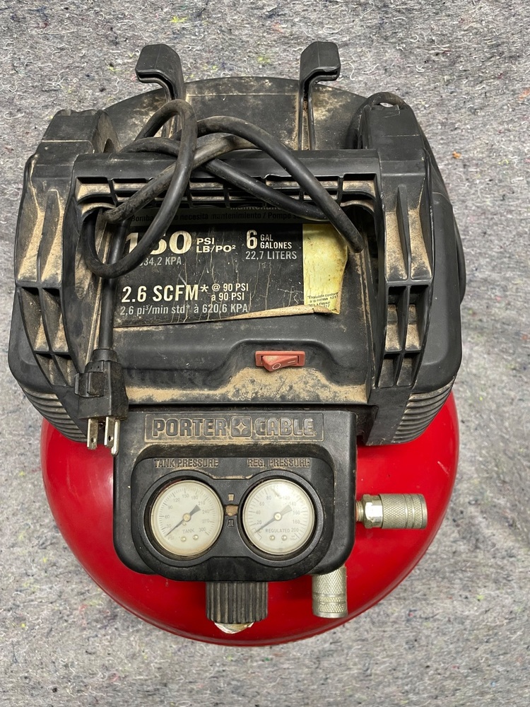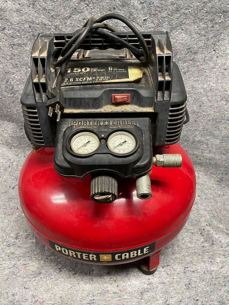 The Porter-Cable 6 Gallon Pancake Air Compressor offers reliable performance at a value that makes pneumatic tools accessible for DIYers and light contractors alike. Delivering 150 Max PSI and 2.6 CFM @ 90 PSI, it provides all the power you need for most home workshop tasks and light professional use. The thoughtfully designed 30 lb. frame with integrated handle makes it easy for anyone to transport between home projects without straining. What sets this Porter-Cable model apart is its user-friendly features - the low amp 120V motor that starts dependably even in unheated garages and winter job sites, eliminating the frustration of compressors that won't start in cold weather. The2-factory-installed quick couplers enable simultaneous operation by2-users. The straightforward regulator and clear pressure gauges make adjustments simple even for pneumatic tool beginners. Built for the practical user who needs reliability without breaking the budget, this compressor delivers Porter-Cable's promise of quality accessible to everyone.