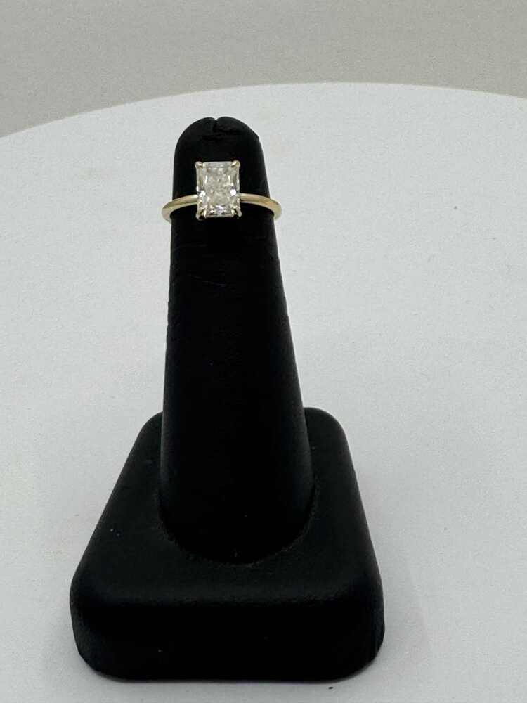 Exquisite elegance meets timeless tradition with this Radiant Cut Moissanite Engagement Ring. This stunning handmade piece showcases a dazzling moissanite stone, cut with precision to exhibit a radiant sparkle that rivals a diamond. The gem, known for its breathtaking light refraction, is held aloft by a classic 14kt yellow gold band. The band’s weight of 2.3 grams adds to its durability and longevity, ensuring it's a piece that will last as long as the love it symbolizes. It brings a contemporary touch to classical style, balancing simplicity and luxury in perfect harmony. This ring isn't just a token of promise; it's a work of art. The gleaming yellow gold serves as the perfect stage for the moissanite’s grandeur, further enhancing its natural shine. When you slide this radiant cut moissanite ring onto your beloved's finger, it will reflect not only light but also the depth of your affection. Engagements are made of special moments worth remembering. Make your proposal truly unforgettable with this exquisite, handcrafted symbol of eternal commitment. Comes with certification papers from GRA |