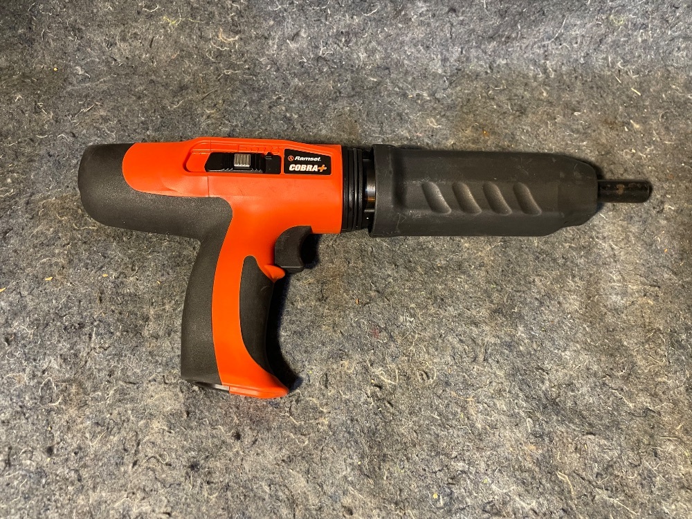 The Ramset Cobra plus 0.27 Caliber Semi-Automatic Powder-Actuated Tool can tackle professional remodeling projects, such as attaching wood to concrete or steel. The adjustable power level increases speed and efficiency and reduces power up to two levels. The silencer feature reduces actuation noise, and the ergonomic grip provides comfort for long jobs. The new auto-load advance feature reduces load waste and accidental misfires. (Note: This product is not sold with any powder actuated material.).