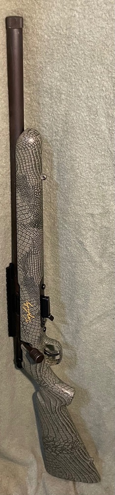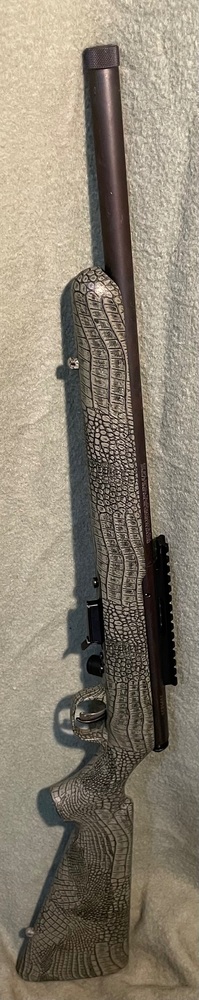 The 93 FV-SR Landry is a harder-hitting model, more suitable for slaying gators. Still compact, this bolt action magazine-fed rifle is chambered for 22 WMR (Winchester magnum rimfire) and has a handy 16.5″ barrel. The barrel appears to have a thread protector on the end, so I’ll assume it is threaded for aftermarket suppressors.