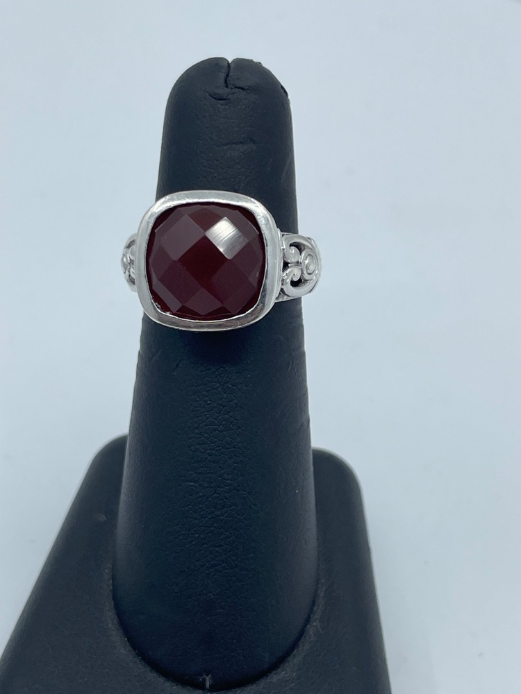 Stunningly mesmerizing, this Red Carnelian Statement Ring is more than just an accessory, it's an experience. The exquisite subtleties of meticulously engraved designs play with light as the multi-faceted gem turns, reflecting your unique style statement. Cut to perfection and set in size 6.5, the fiery depths of the red carnelian stone capture the essence of passion and power. Adorn your hand with this ring and let it become a constant, luxurious reminder of your inner fire.