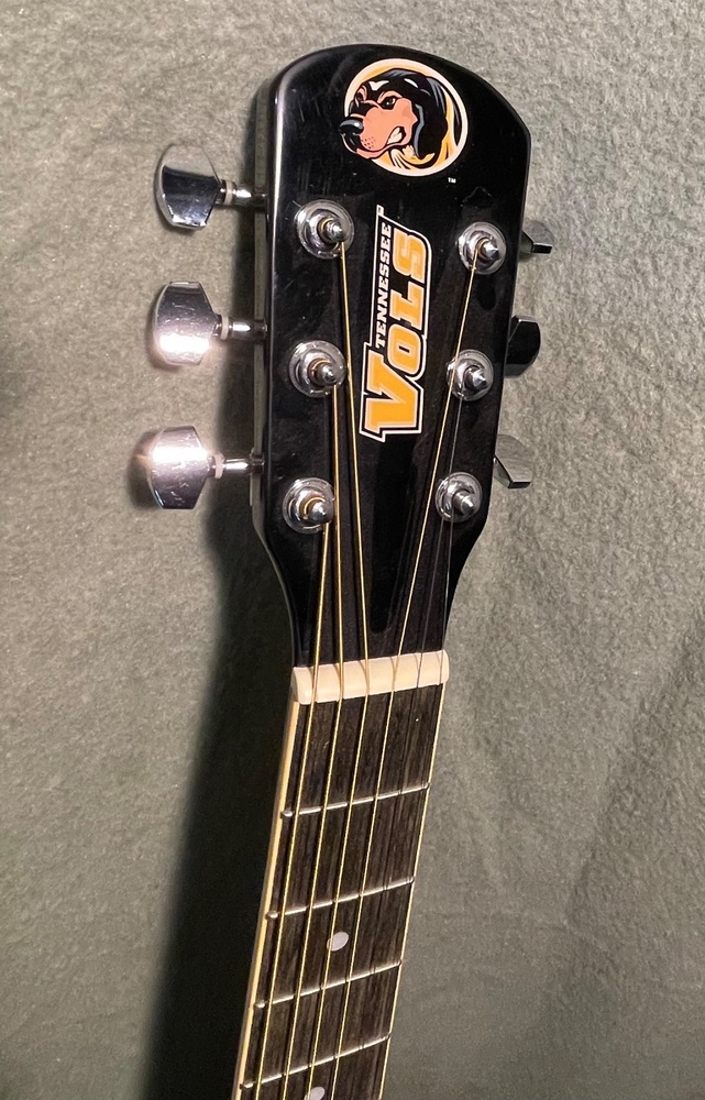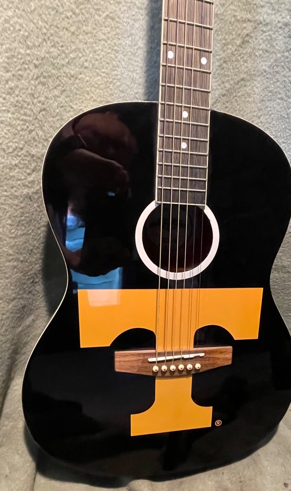 It features a spruce top with mahogany sides and back, finished in black—with the UT orange logo on the front and Smokey on the headstock. Naturally, this guitar will sound best when it’s played in or near Knoxville, but it will work anywhere you want to show your Volunteer spirit.